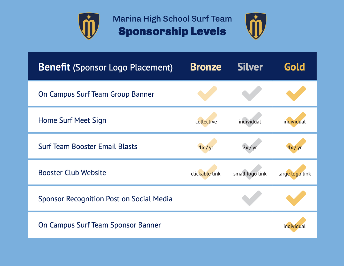 For each sponsorship level, the Marina High School Surf Team Booster Club provides a variety of incentives designed to maximize your company’s visibility in the community.
